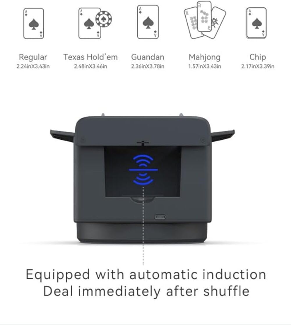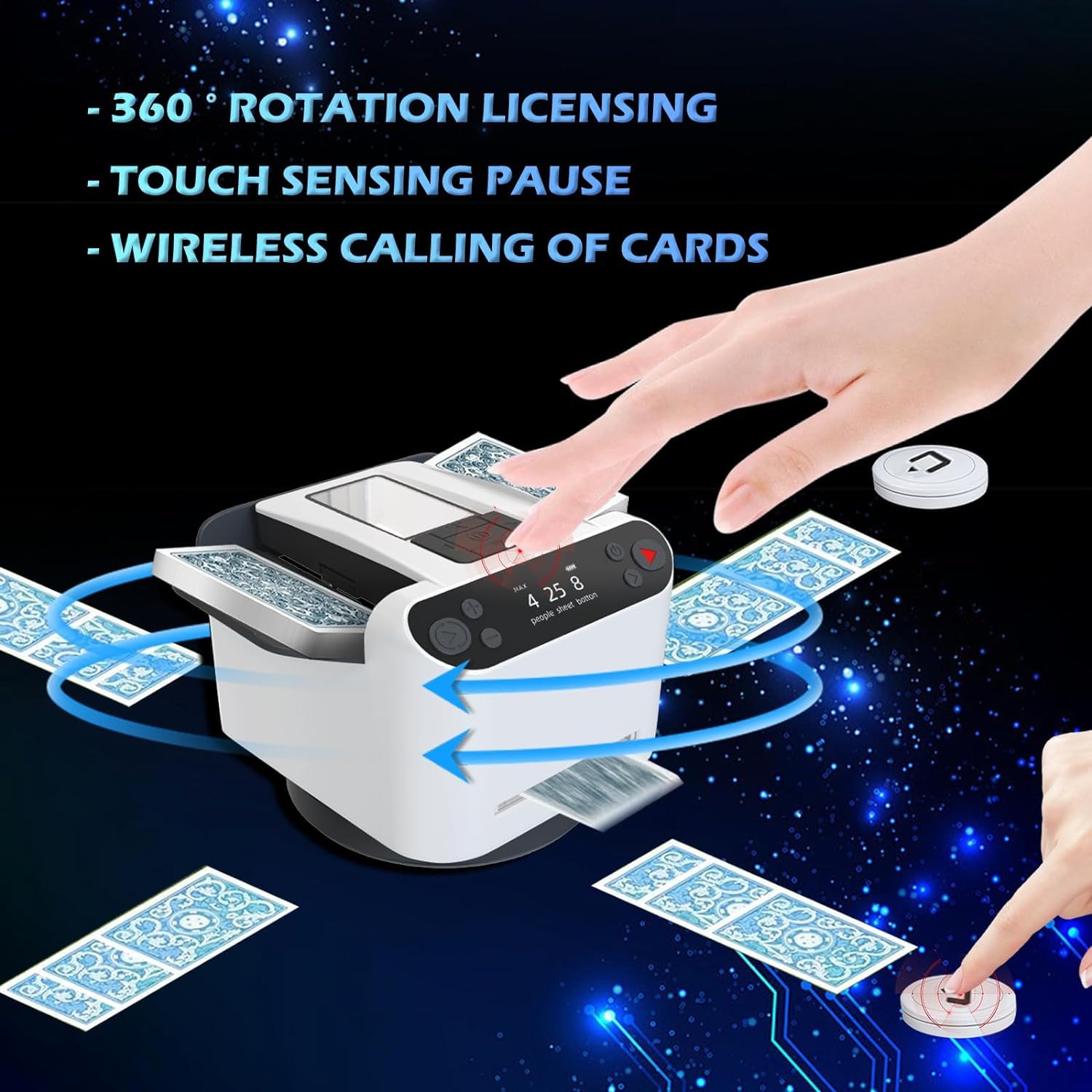 CUSTOMISZE SETTINGS & TOUCH DESIGN: The auto card dealer offers versatile customization options for the number of players, the quantity of cards dealt, and shared card quantity. With a card tray capacity of 2 decks, auto-deals for up to 148 decks, and pause dealing cards by touching a designated area, resuming with a click on the same pause sensing spot